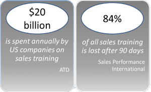 Sales Training is Not Enough. $20 billion is spent annually by US companies on sales training, yet 84% of all sales training is lost after 90 days. Training and coaching are not enough. Field marketing and sales enablement teams, need to provide the right content and tools for the sales skills and sales methods to take hold. Sales content and sales tools should be useful, not only to sales managers and sales coaches but also directly to sales professionals for call preparation and for use in the limited and valuable time that they spend with customers in conversation.