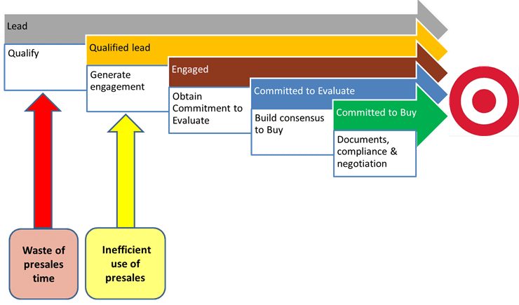 The Sales Process and the Entry of Presales. Presales professionals are invariably brought into a sales process partway through it, but their point of entry is an important variable. Looking at a typical process, for any new lead, a sales rep starts by qualifying the lead. Generating account engagement is often hard work and is a necessary step before the aim can be to obtain a commitment to evaluate our product. Building consensus to buy then becomes the central sales team objective through the evaluation phase as buyers evaluate and a solution is configured and refined. All of this is usually necessary before that sometimes-faint, light-at-the-end-of-the-tunnel appears when the buying team is committed to buy and willing to move documents, compliance and negotiation through their own process.