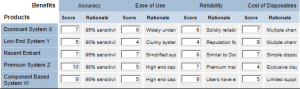 Then they engage in a detailed discussion of how each product scores in terms of each of the benefits, assigning a score from 1 to 10. They keep track of the rationale for their scores and gather information about the market size of each of their competitors.